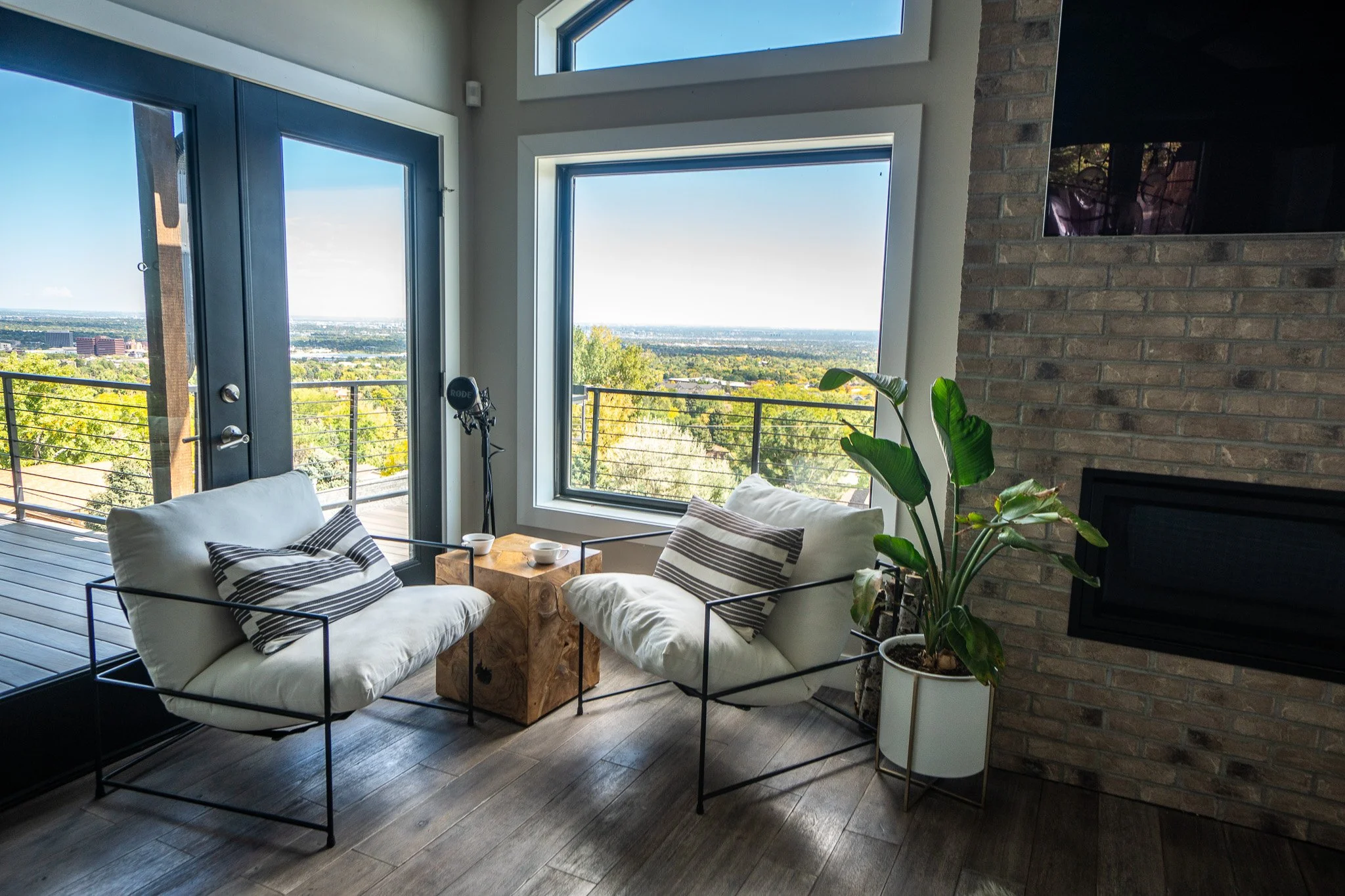 A private, multi-level residence featuring panoramic skyline views, 15-ft vaulted ceilings, abundant natural light, and seamless ground-level load-in for commercials, interviews, and brand photography
